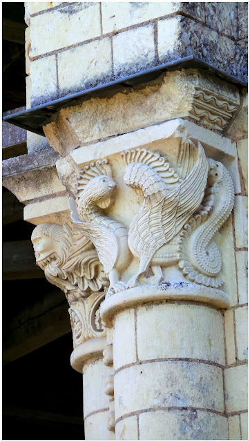 Les chapiteaux se trouvent pris dans ces constructions postérieures, ce qui empêche malheureusement d'observer toutes leurs faces. Vous en trouverez une description très précise en cliquant sur ce lien.